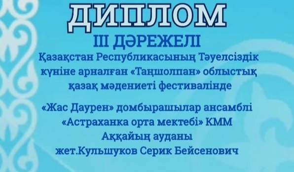 С гордостью сообщаем, что ансамбль домбристов «Жас Даурен» КГУ «Астраханская средняя школа» Аккайынского района руководитель - Кульшуков Серик Бейсенович достойно представил наш район на этом значимом мероприятии.